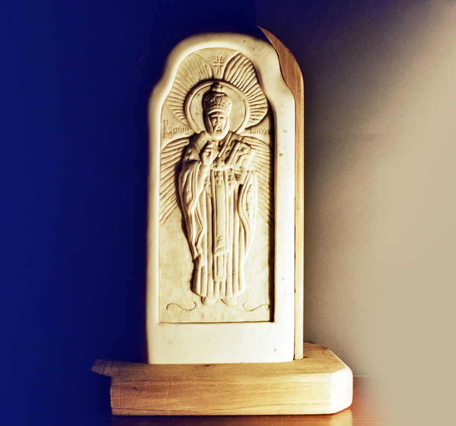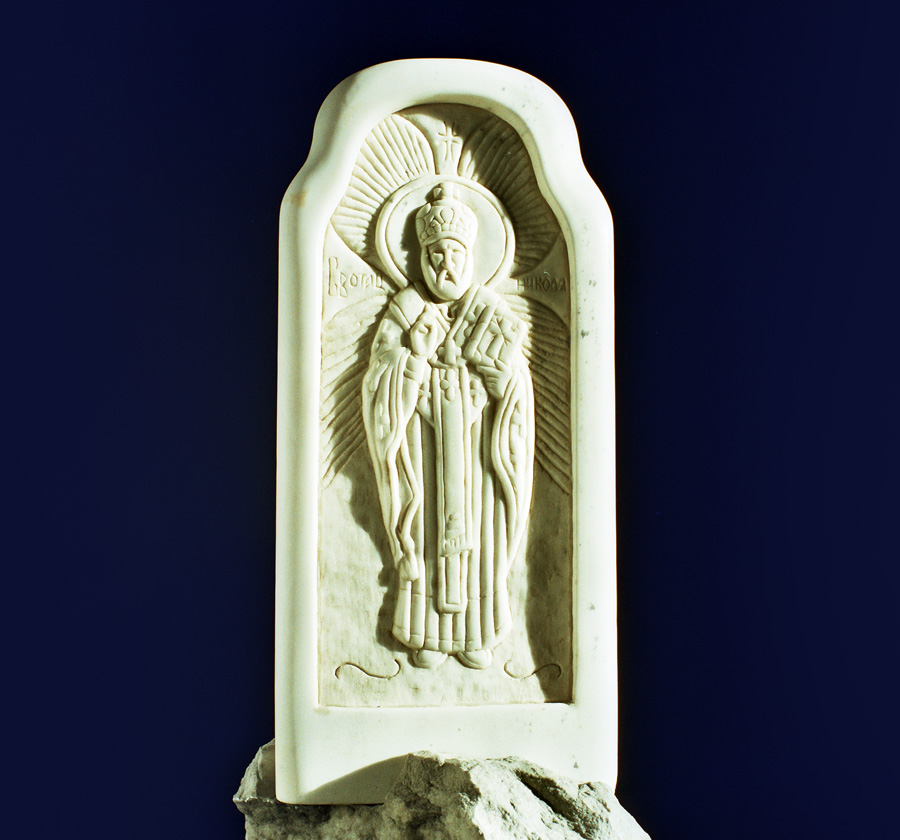 This magnificent energy and the way it influences the family have inspired the artist to start exploring Byzantine iconography. Mateja has created his first Byzantine icon in ba-relief, the icon of Jesus Christ. In the following years Mateja continued crafting icons in different kinds of marble and inbreathing a subtle artistic note to each, while perfecting his craftsmanship at the same time. This is when many of his marble icons were created: Jesus Christ, St. Nicholas, St. Peter and Paul, St. Michael, St. Gabriel, St. George, The Virgin Mary, etc.